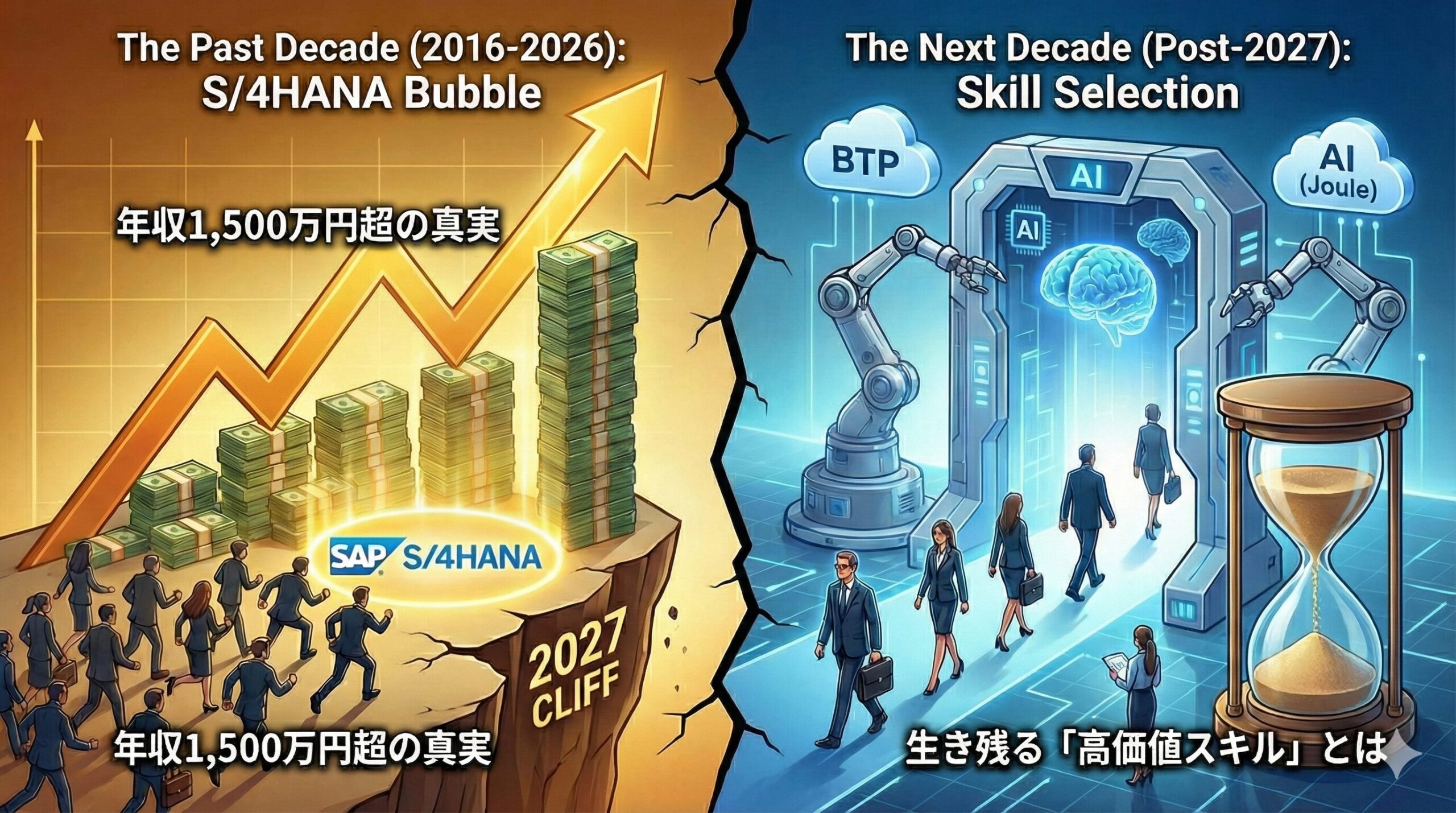 IT業界、特にERP界隈において「SAPができる」という事実は、この10年間、最強のプラチナチケットであり続けました。右肩上がりの年収、止まらないスカウトメール、そして「2027年の崖」という名の特需。