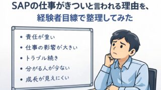 将来性 SAPの仕事がきついと言われる理由を、経験者目線で整理してみた はじめに|「きつい」と感じたことがあるのは、あなただけじゃないSAPの仕事を続けていると、あるタイミングでふと、正直、ち... 2026.01.04 SAPキャリア将来性